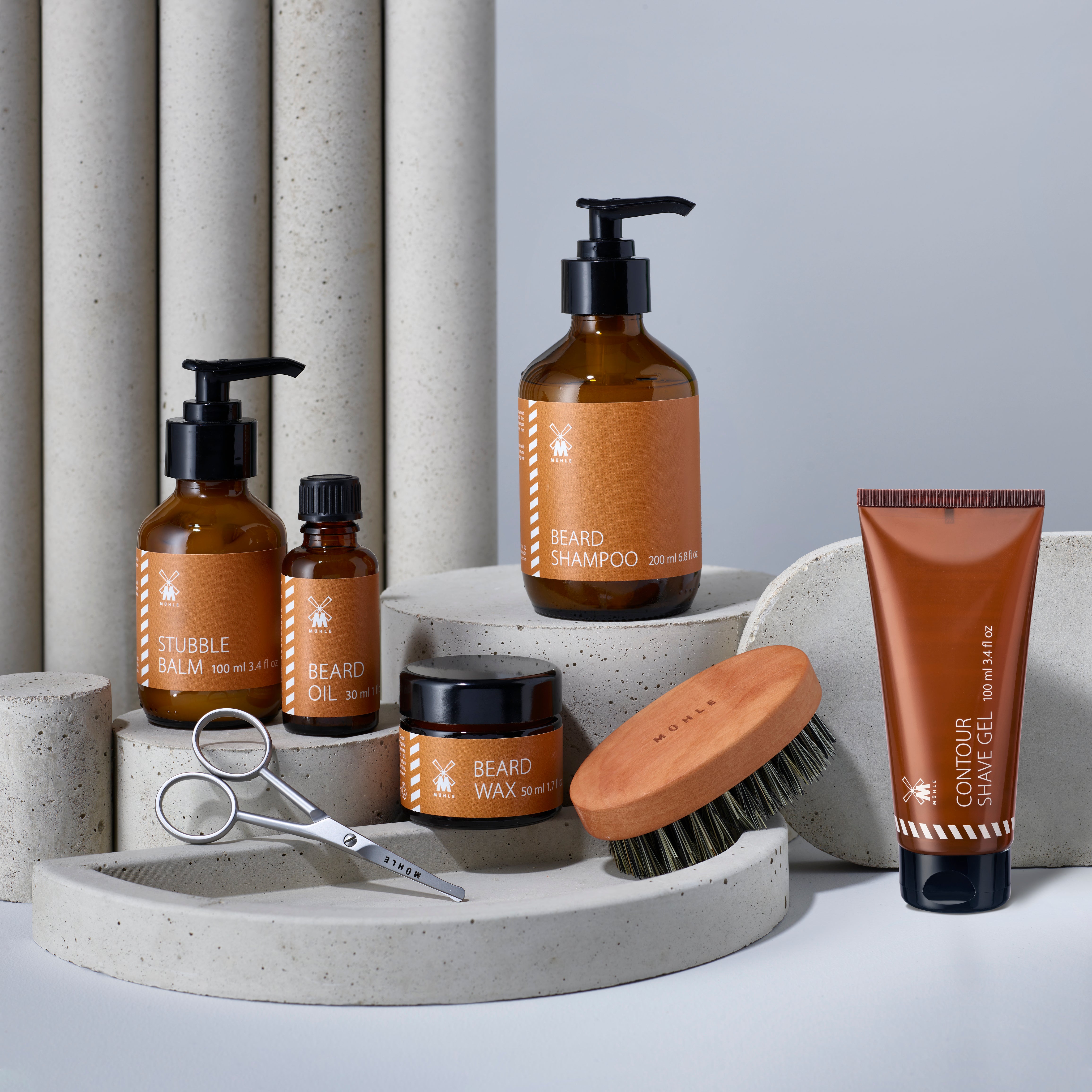 The new transparent Contour Shave Gel by MÜHLE with subtle scents of cedar wood and bergamot for precise shaving - especially of fine beard contours.