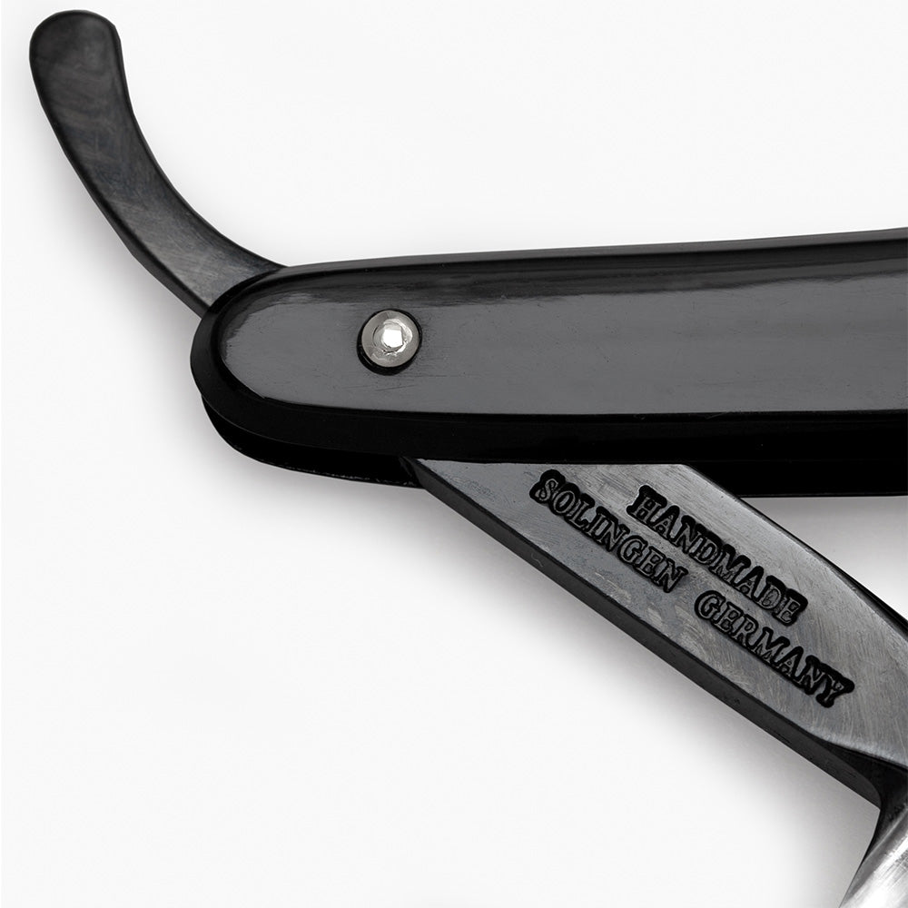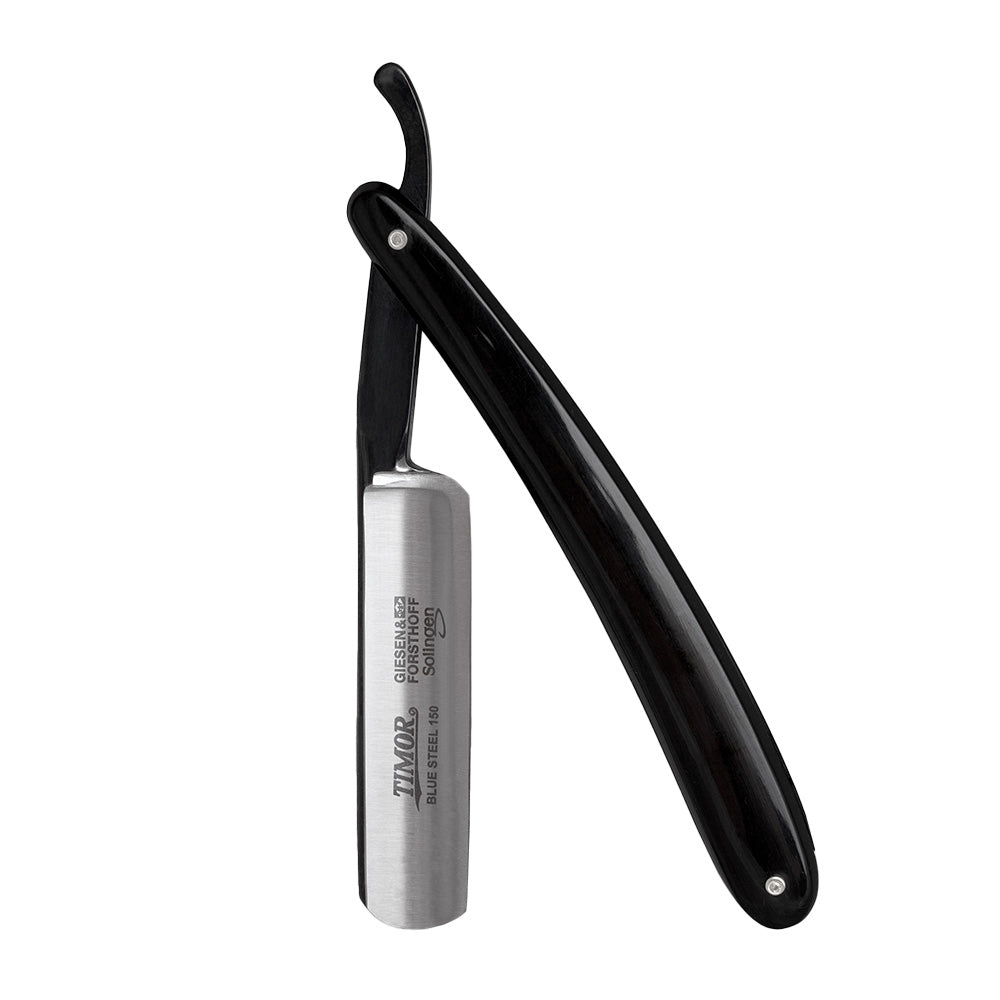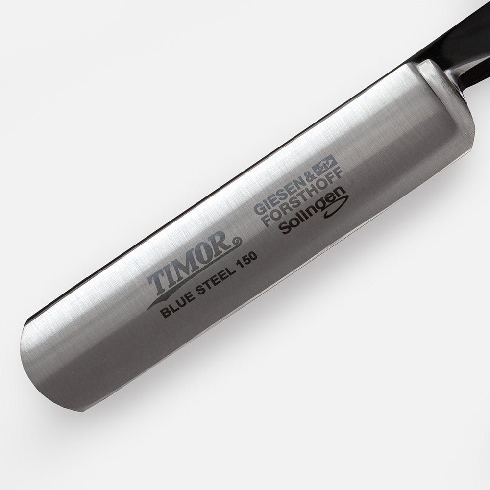 Giesen & Forsthoff Timor® Blue Steel Straight Razor, black plastic handle, oxidized 5/8" carbon steel blade