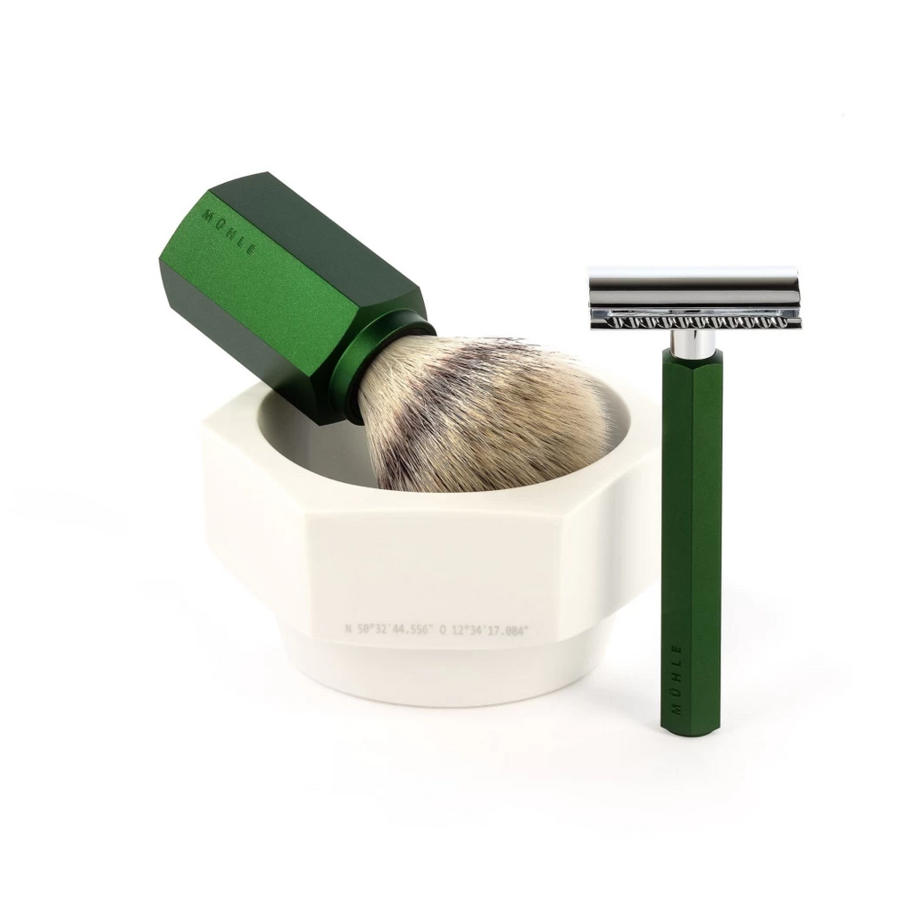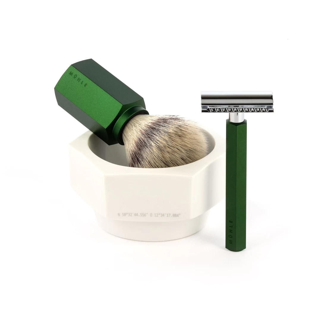 The HEXAGON series, which was created in cooperation with the Berlin designer Mark Braun, is a nifty way to shave. The hexagonal design pays tribute to the archetypal shape of tools or writing instruments. It promises ergonomics, grip and functionality. Its sleek finish in graphite and forest is complemented by a puristic silver colour. The perfect contrast is ensured by the high-gloss, chrome-plated surfaces of the safety razor and holder. HEXAGON: cosmopolitan design. Made in Stützengrün.